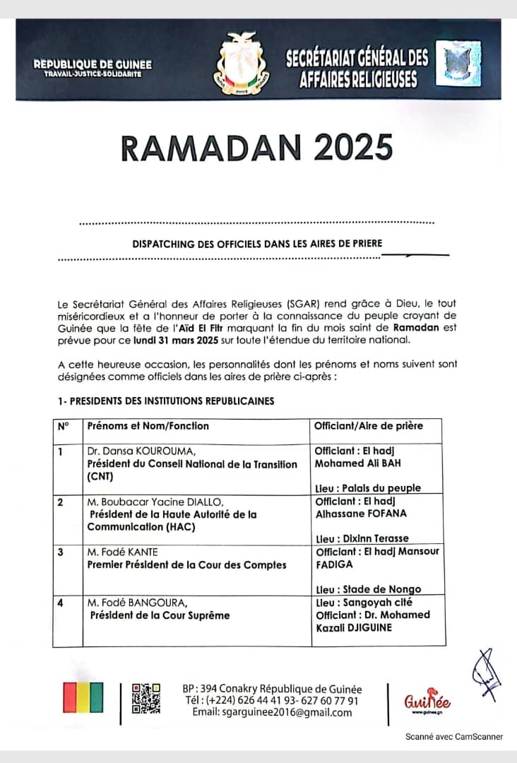 Le Secrétariat Général des Affaires Religieuses (SGAR) a annoncé que la fête de l’Aïd El Fitr, marquant la fin du mois sacré du Ramadan, sera célébrée le dimanche 30 mars 2025 sur toute l’étendue du territoire national guinéen. À cette occasion, des personnalités religieuses ont été désignées pour officier les prières dans les différents lieux de rassemblement à travers le pays.