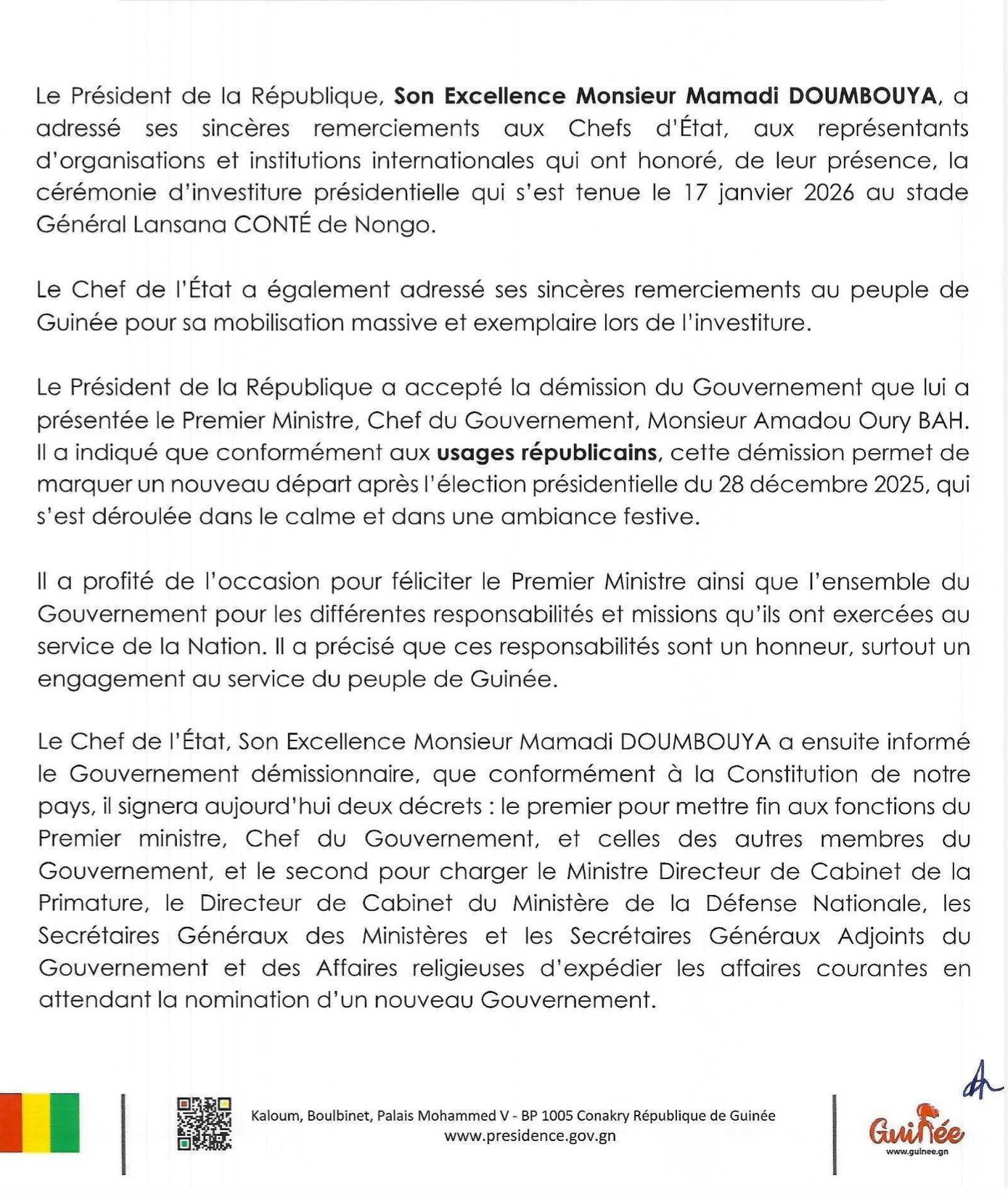 NEWSPOLITIQUE Après la démission du gouvernement, le président Doumbouya signera deux décrets ce jeudi Par Directeur de Publication - 22 janvier 2026 5617 Facebook Twitter Pinterest WhatsApp Ledenonciateur224.com Partager : Cliquez pour partager sur Facebook(ouvre dans une nouvelle fenêtre) Facebook Cliquer pour partager sur X(ouvre dans une nouvelle fenêtre) X ARTICLES CONNEXESPLUS DE L'AUTEUR Guinée : l’heure des choix forts pour réussir la refondation Journée mondiale de l’Éducation : l’ONG OMEGA sonne l’alarme sur l’avenir scolaire des enfants guinéens Guinée : le DGA de l’Office Guinéen de Publicité suspendu après des propos jugés diffamatoires LES PLUS POPULAIRESNEWS1680FAITS-DIVERS753POLITIQUE524ÉCONOMIE266SPORT123INTERNATIONAL77