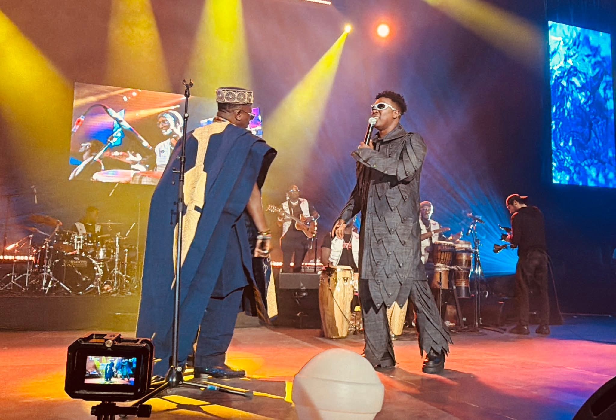 À 21h44, les neuf musiciens et quatre choristes d’Azaya prennent place pour un live annoncé comme grandiose. La griotte Djely Kanny Fanta introduit l’artiste avec fierté, retraçant son parcours et son rôle central dans l’évolution de la musique guinéenne contemporaine.
