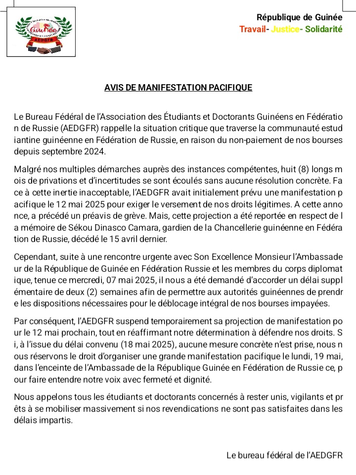 Face au non-versement des compléments de bourses pour l’année académique 2024-2025, l’Association des Étudiants et Doctorants Guinéens en Fédération de Russie annonce une manifestation pacifique devant l’ambassade de Guinée à Moscou, prévue pour le 19 mai 2025. Une mobilisation qui traduit le ras-le-bol d’une communauté estudiantine en quête de justice sociale et de soutien financier.