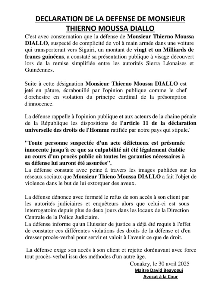 Le 12 avril dernier, un braquage spectaculaire a coûté 21 milliards de francs guinéens sur l’axe Kindia-Mamou. Moins d’un mois après, sept suspects ont été interpellés, dont Thierno Moussa Diallo, présenté comme le cerveau présumé de l’opération. Mais déjà, des zones d’ombre émergent : dans un communiqué, son avocat dénonce de graves atteintes aux droits de la défense, notamment la diffusion publique de l’image de son client et l’impossibilité d’entrer en contact avec lui. Voici ledit communiqué