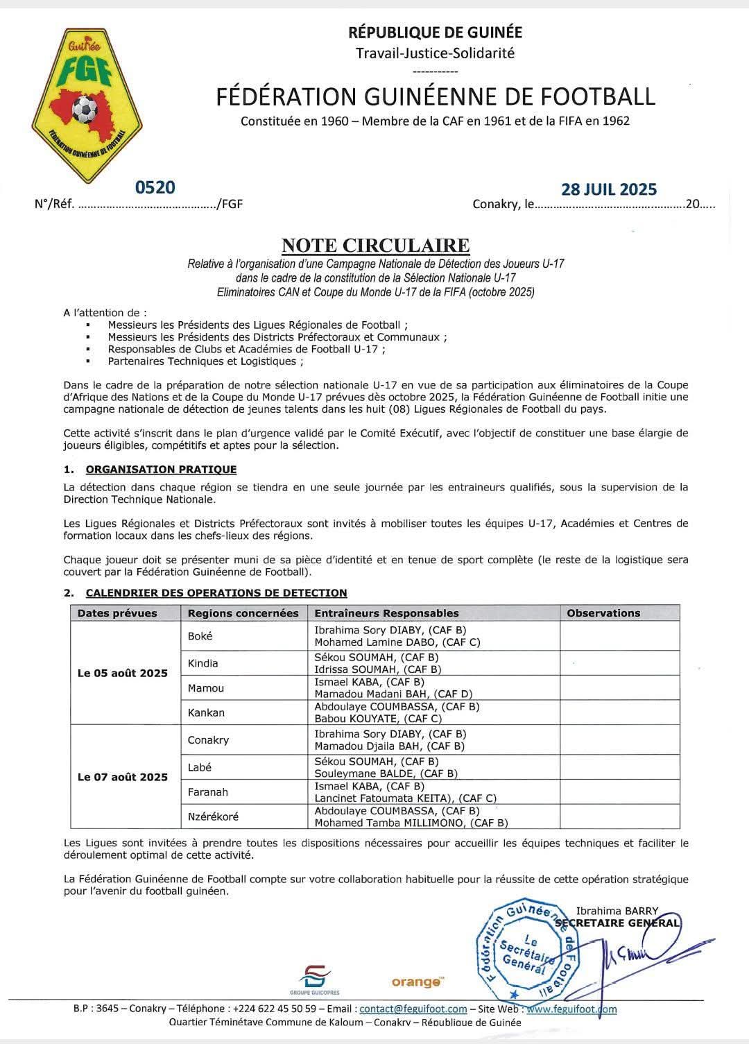 Selon une note circulaire transmise aux structures régionales et consultée par Ledenonciateur224.com, cette initiative s’inscrit dans le plan d’urgence validé par le Comité exécutif de la fédération. Elle vise à élargir la base de données de joueurs éligibles et compétitifs, capables d’intégrer la future sélection nationale des moins de 17 ans.