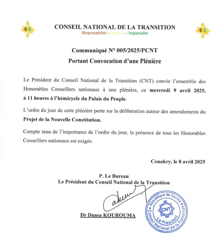 Dans un communiqué adressé à la rédaction du quotidien Ledenonciateur224.com, en date du mardi 8 avril 2025, le président du Conseil National de la Transition (CNT), Dr Dansa Kourouma, a invité l’ensemble des conseillers nationaux à participer à une plénière prévue pour ce mercredi 9 avril.
