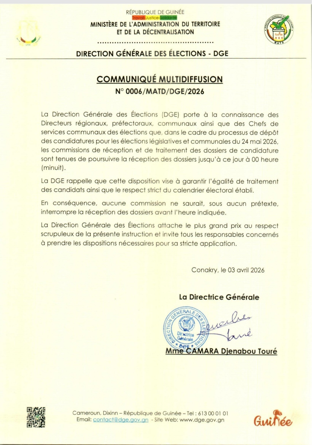NEWSPOLITIQUE Date butoir du dépôt des candidatures aux élections communales et législatives : un nouveau communiqué de la DGE soulage les candidats Par Directeur de Publication - 3 avril 2026 2457 Facebook Twitter Pinterest WhatsApp Ledenonciateur224.com Partager : Partager sur Facebook(ouvre dans une nouvelle fenêtre) Facebook Partager sur X(ouvre dans une nouvelle fenêtre) X ARTICLES CONNEXESPLUS DE L'AUTEUR Législatives et communales en Guinée : le RGT entre en lice avec une forte mobilisation Hommage du Président de la HAC suite au décès du grand imam de Kankan Port Autonome de Conakry: Le Directeur Général Aly Koïta reçoit des mareyeuses LES PLUS POPULAIRESNEWS1900FAITS-DIVERS852POLITIQUE577ÉCONOMIE310SPORT137INTERNATIONAL106