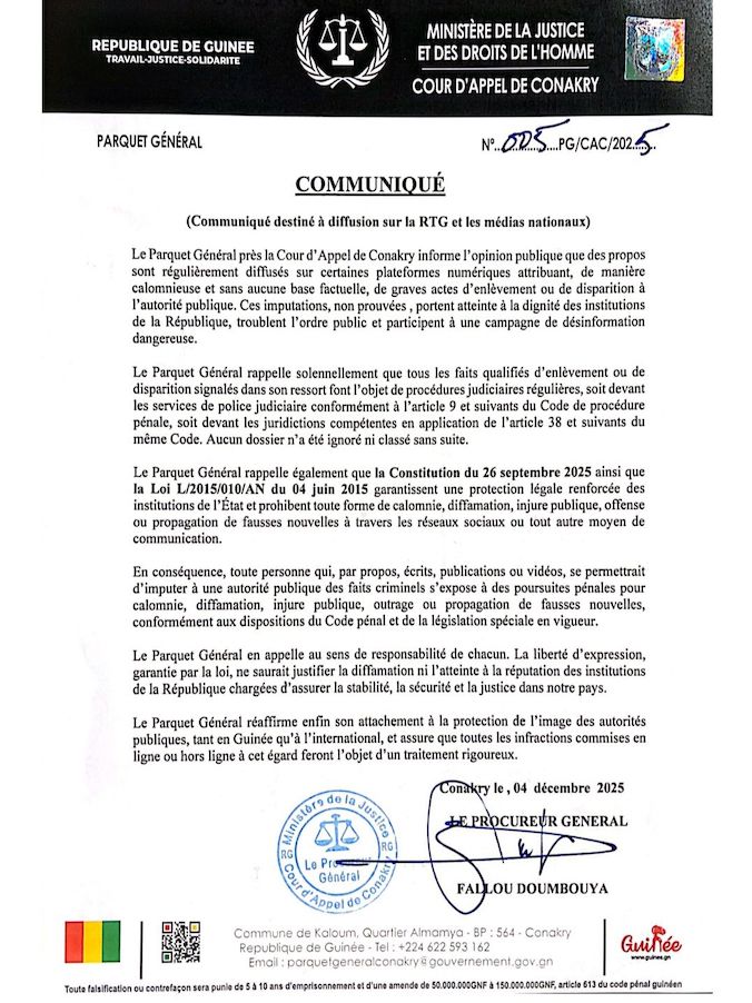 Le Parquet Général près la Cour d’Appel de Conakry a haussé le ton, ce jeudi 4 décembre 2025, face à la multiplication des dénonciations liées à des cas présumés d’enlèvements ou de disparitions attribués aux autorités publiques. Dans une note officielle parvenue à Ledenonciateur224.com, le Procureur Général Fallou Doumbouya a lancé un avertissement ferme, dénonçant des allégations qu’il juge infondées et dangereuses.