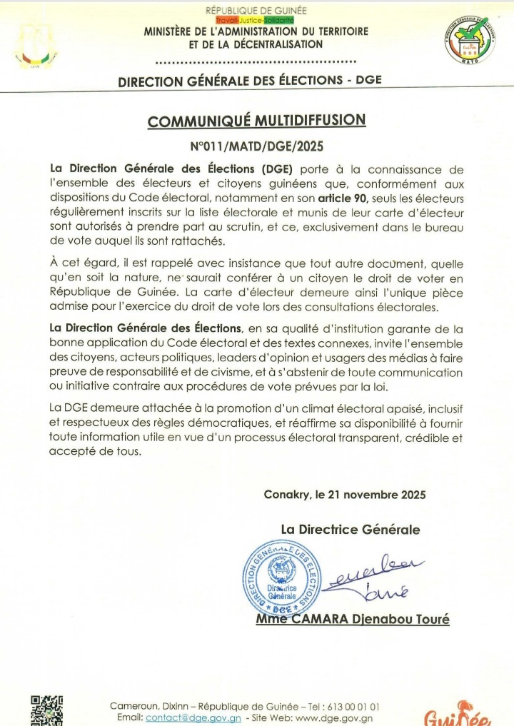 La Direction Générale des Élections (DGE) a rappelé aux électeurs guinéens, à travers un communiqué officiel, que seuls les citoyens régulièrement inscrits sur la liste électorale et munis de leur carte d’électeur sont autorisés à participer aux élections en République de Guinée. Selon l’article 90 du Code électoral, aucun autre document, quel qu’il soit, ne peut remplacer la carte d’électeur pour l’exercice du droit de vote.