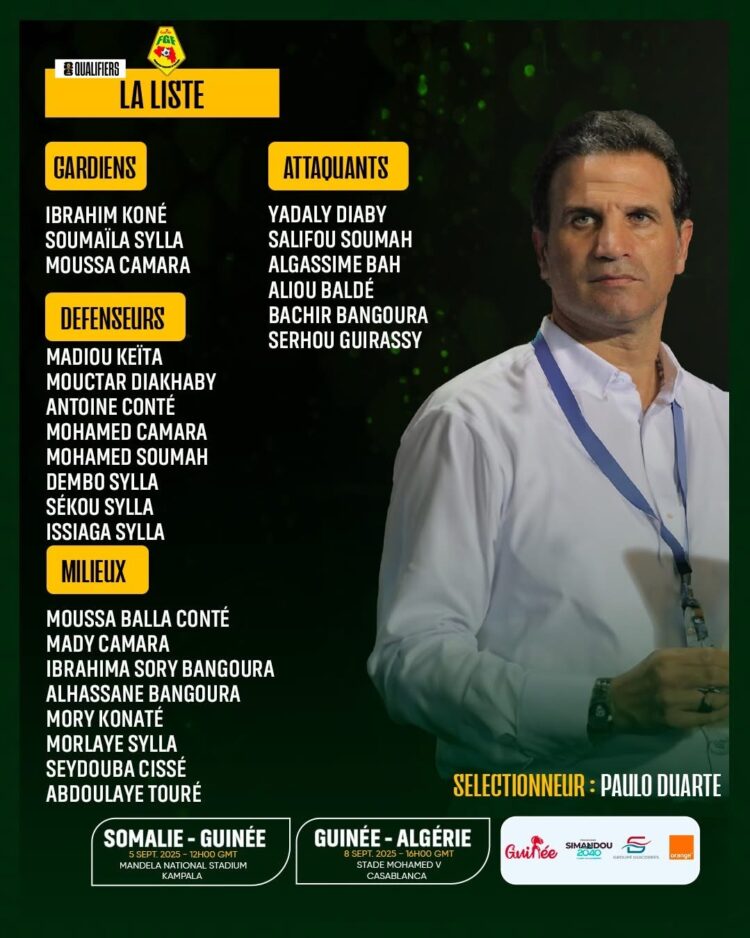 Pour ces deux rendez-vous décisifs, le technicien portugais a retenu un groupe de 25 joueurs, parmi lesquels figurent deux éléments issus du championnat guinéen. Il s’agit d’Alhassane Bangoura et du jeune Bachir Bangoura, tous deux pensionnaires du Milo FC, récemment revenus du CHAN.