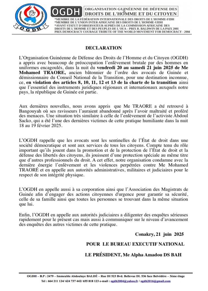 FAITS-DIVERSNEWS Enlèvement brutal de Me Traoré : l’OGDH déplore cette violation des droits humains Par Directeur de Publication - 21 juin 2025 5031 Facebook Twitter Pinterest WhatsApp Partager : Cliquez pour partager sur Facebook(ouvre dans une nouvelle fenêtre) Facebook Cliquer pour partager sur X(ouvre dans une nouvelle fenêtre) X ARTICLES CONNEXESPLUS DE L'AUTEUR Bah Oury installé à la Primature : » Le temps des crises est derrière nous, place à la projection « Nigeria : 16 officiers poursuivis pour un présumé complot contre le régime de Bola Tinubu Médias en Guinée : la HAC lance un vaste recensement national des organes de presse LES PLUS POPULAIRESNEWS1690FAITS-DIVERS758POLITIQUE528ÉCONOMIE266SPORT123INTERNATIONAL78