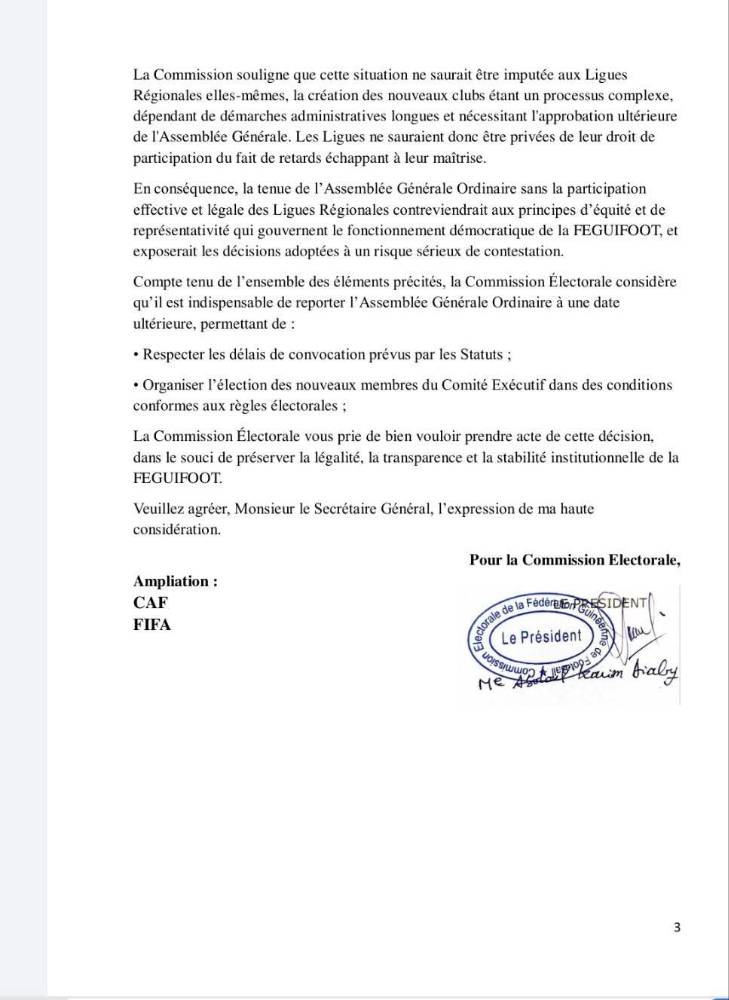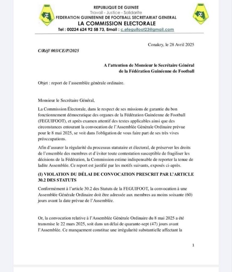 La crise qui secoue la Fédération guinéenne de football est loin de connaître son épilogue. Après la révocation contestée de l’ex-président Bouba Sampil, une Assemblée générale ordinaire était annoncée pour le 8 mai, censée statuer notamment sur son sort à la tête de l’institution. Mais ce lundi 28 avril, la Commission électorale a officiellement demandé son report, évoquant plusieurs irrégularités susceptibles de compromettre le bon déroulement de la rencontre.