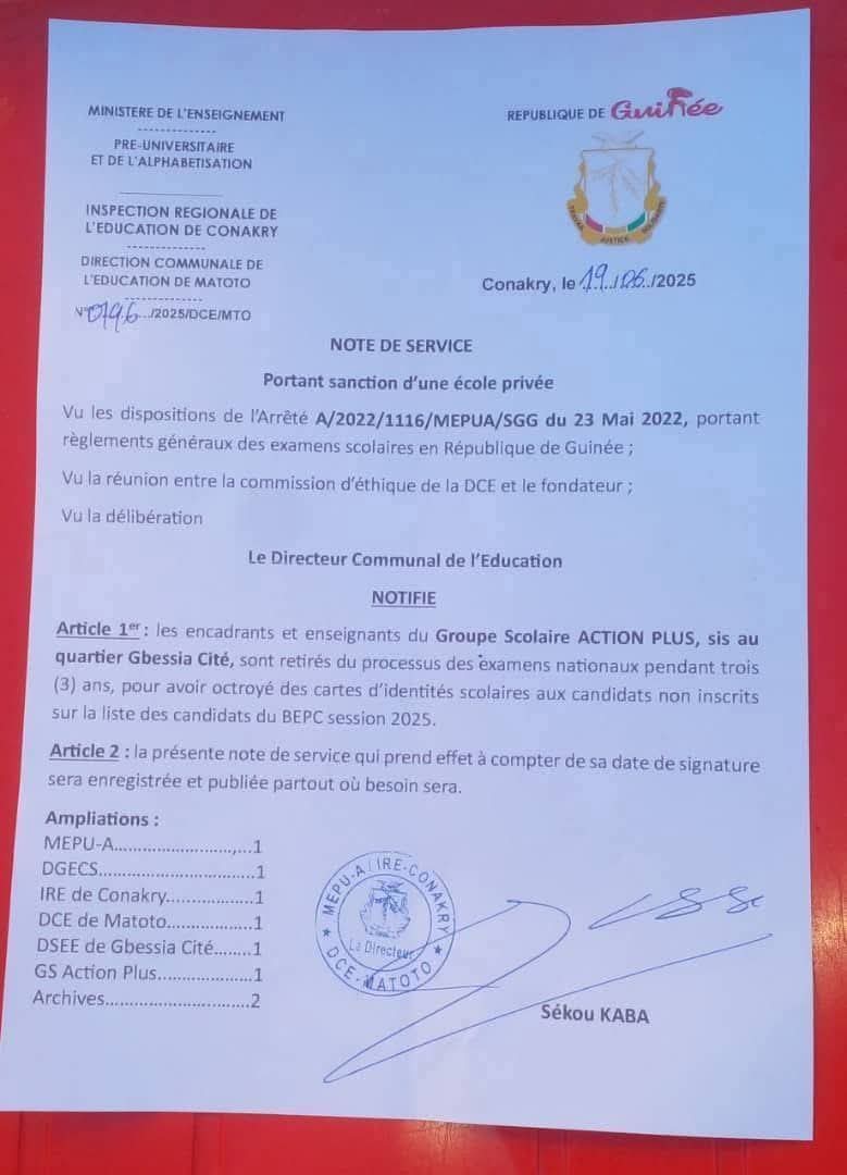 Face à cette présumée tentative de fraude, la Direction Communale de l’Éducation (DCE) de Matoto a réagi avec fermeté. Dans une note de service rendue publique ce jeudi, elle annonce l’exclusion de tous les encadrants et enseignants de l’établissement « Action Plus » du processus des examens nationaux pour une durée de trois ans.