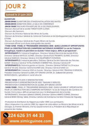 Sous le thème principal « PROGRAMME SIMANDOU 2040 : Quels leviers et opportunités pour la construction des champions nationaux : Entre enjeux, défis et perspectives » et le sous-thème pour cette deuxième journée, concerne les secteurs de l’Énergie, les hydrocarbures et matériaux de construction, catalyseurs du développement durable. Panels d’experts, présentations techniques et échanges d’expériences vont se succédé, réunissant décideurs publics, opérateurs privés, chercheurs et partenaires techniques autour d’une ambition commune : faire de la Guinée un pôle énergétique et industriel de référence.