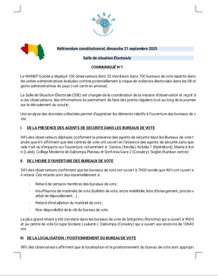 Conakry, 21 septembre 2025 — À l’occasion du scrutin électoral de ce 21 septembre, le Réseau Ouest Africain pour l’édification de la Paix (WANEP-Guinée) a publié un premier communiqué d’observation électorale. Grâce à un dispositif de déploiement sur l’ensemble du territoire, l’organisation dresse un état des lieux initial du déroulement du vote, mettant en lumière les forces et les failles constatées dans les premières heures de l’élection.