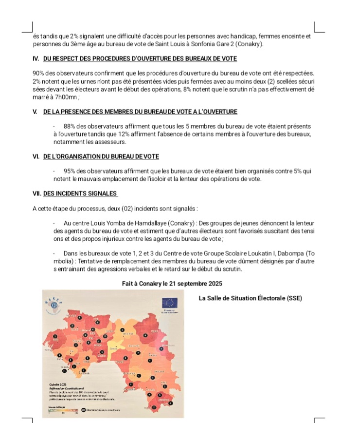 Selon le rapport, 94 % des bureaux de vote observés disposaient de la présence d’agents de sécurité au moment de l’ouverture, témoignant d’un effort notable des autorités pour garantir un climat sécurisé. Toutefois, 6 % des bureaux ont ouvert sans présence sécuritaire, notamment à Santou (Kindia), Kobéla 1 (Nzérékoré), Koïn (Labé), Dabompa Plateau et Sonfonia Gare 2 (Conakry), ainsi qu’à Sogbè (Kankan). WANEP note néanmoins que cette absence n’a pas directement entravé le démarrage des opérations.