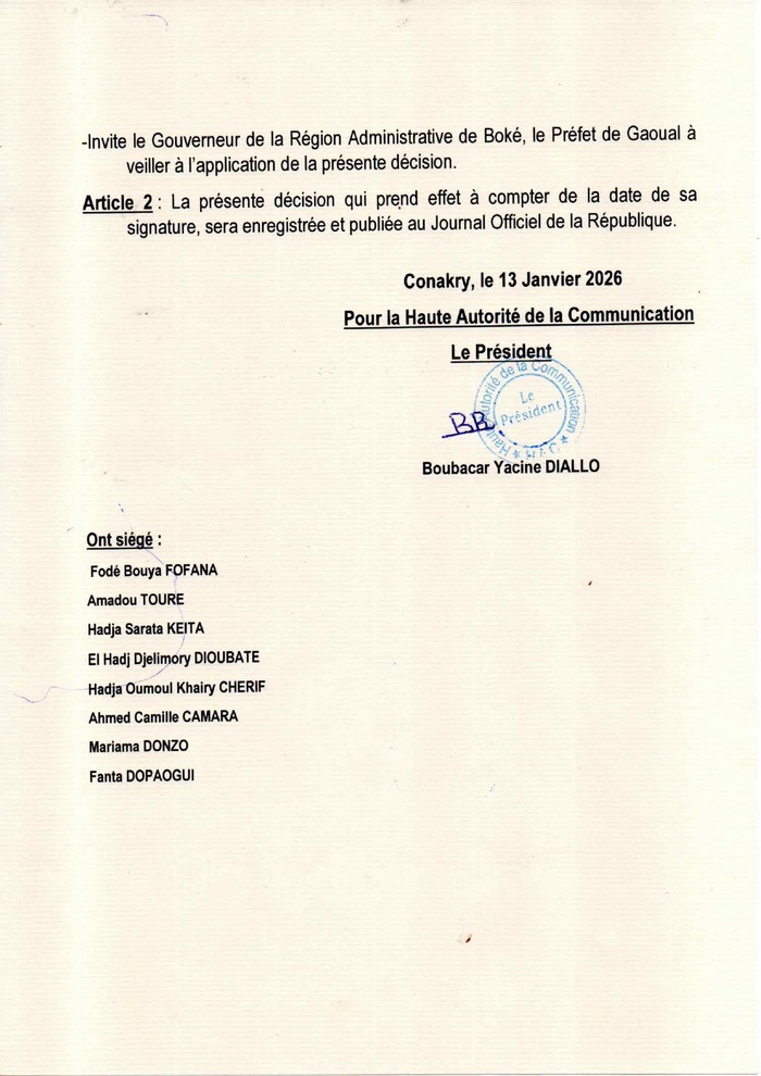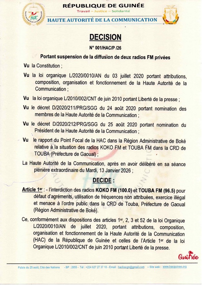 La Haute Autorité précise que cette mesure s’inscrit dans le strict respect des textes en vigueur, notamment les articles 1er, 2, 3 et 52 de la loi organique L/2020/0010/AN de juillet 2020, portant attributions, organisation et fonctionnement de la HAC en République de Guinée, ainsi que les dispositions de l’article 1er de la loi organique L/2010/002/CNT de juin 2010, relative à la liberté de la presse.