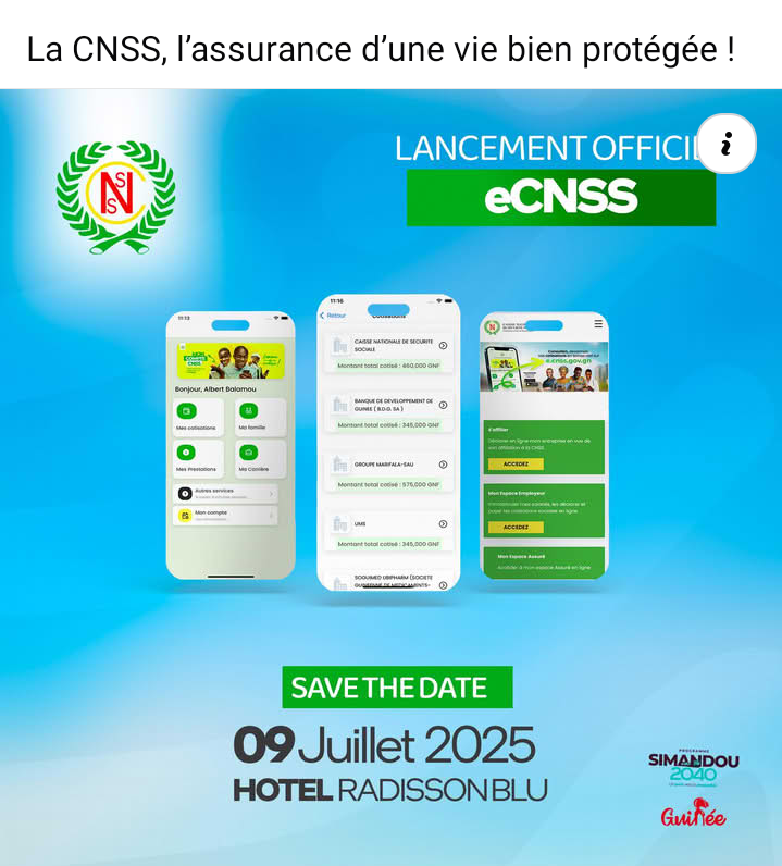 Le mercredi 9 juillet 2025, à l’hôtel Radisson Blu de Kipé, dans la commune de Ratoma (Conakry), la CNSS procédera au lancement officiel de sa toute nouvelle plateforme numérique de téléprocédures sociales, baptisée #eCNSS.