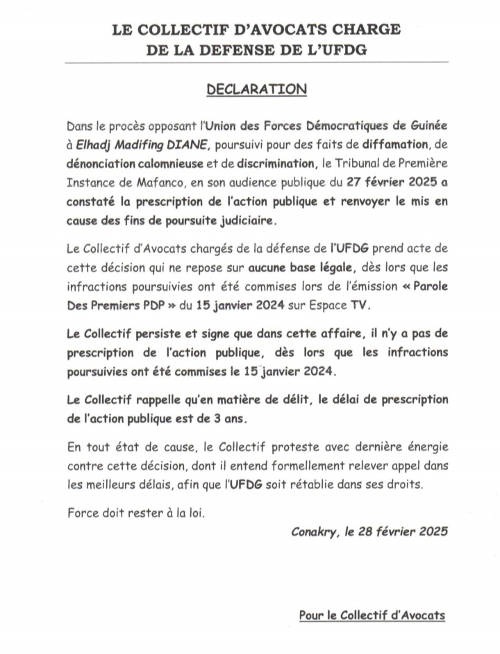 Le collectif d’avocats de l’Union des Forces Démocratiques de Guinée (UFDG) exprime sa colère après la décision du tribunal de première instance de Mafanco, qui a renvoyé Mafiging Diané pour des fins de poursuites judiciaires. Ce dernier est accusé de diffamation, de dénonciation calomnieuse et de discrimination, des charges qui suscitent une vive réaction parmi ses défenseurs.