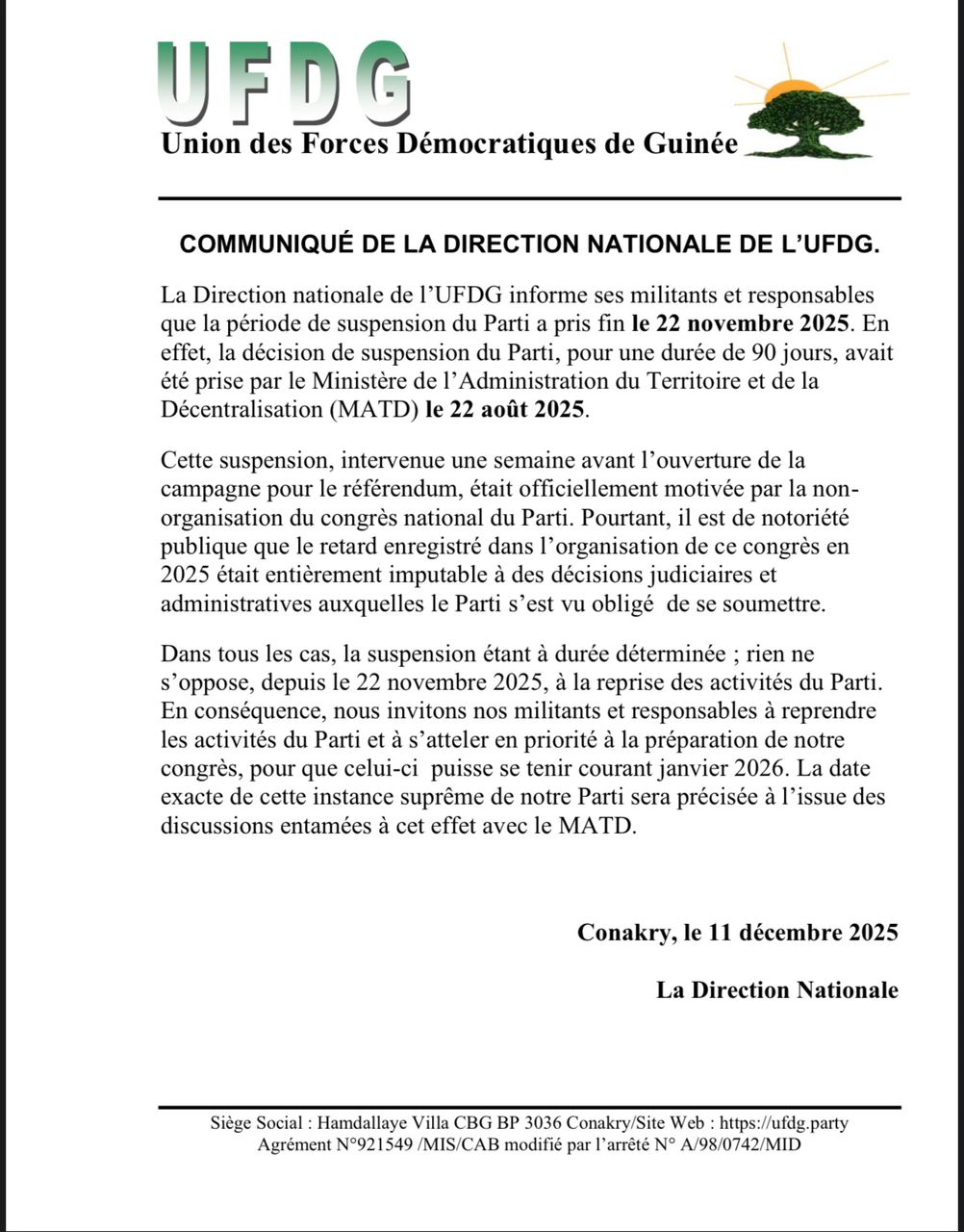 Voici une version enrichie avec un ton plus dynamique, ainsi que plusieurs propositions de L’UFDG annonce que la suspension de 90 jours imposée par le ministère de l’Administration du Territoire et de la Décentralisation (MATD) a officiellement pris fin le 22 novembre 2025. Le parti invite ainsi l’ensemble de ses militants et structures à reprendre pleinement leurs activités.