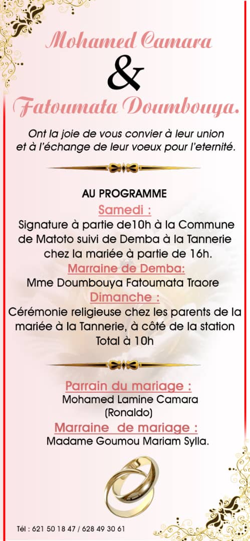 Le moment tant attendu est enfin arrivé. Après des années de célibat, Mohamed Camara, journaliste et administrateur du site libérationinfo.com, a décidé de tourner une nouvelle page de sa vie. Il s’apprête à unir son destin à celui de Mademoiselle Fatoumata Doumbouya. La cérémonie de mariage se tiendra les 1er et 2 février 2025, au cœur du quartier Yimbaya Tannerie, dans la commune de Gbessia.