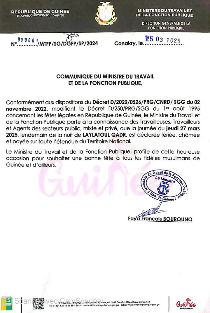 FAITS-DIVERSNEWS Nuit du Destin du Ramadan : Le gouvernement guinéen proclame le jeudi 27 mars jour férié, chômé et payé Par Directeur de Publication - 26 mars 2025 6117 Facebook Twitter Pinterest WhatsApp À l’occasion de la Nuit du Destin du mois sacré de Ramadan, le ministère du Travail et de la Fonction publique de Guinée a annoncé que la journée du jeudi 27 mars sera déclarée fériée, chômée et payée pour l’ensemble des travailleurs du pays. Partager : Cliquez pour partager sur Facebook(ouvre dans une nouvelle fenêtre) Facebook Cliquer pour partager sur X(ouvre dans une nouvelle fenêtre) X ARTICLES CONNEXESPLUS DE L'AUTEUR Kankan : Media / La radio Horizon reprend ses émissions après plusieurs mois d’interruption de son signal Guinée : Le Président de la République dévoile la structure gouvernementale Décret : Amadou Oury Bah reconduit premier ministre LES PLUS POPULAIRESNEWS1685FAITS-DIVERS756POLITIQUE526ÉCONOMIE266SPORT123INTERNATIONAL77