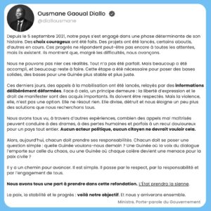 À l’orée de la fin de la transition prévue pour le 31 décembre 2024, Ousmane Gaoual Diallo a fait un point sur les trois années écoulées dans un message publié ce vendredi 27 décembre sur son compte X. Ce bilan intervient dans un contexte de tensions croissantes, marqué par les appels à manifester, notamment dans la région de Conakry. Le ministre a souligné les avancées réalisées tout en insistant sur la préservation des acquis et le respect de la paix sociale.