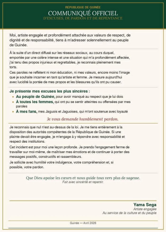 L’artiste guinéenne Yama Sega a officiellement présenté ses excuses publiques ce 16 avril 2026, dans un contexte de vive polémique sur les réseaux sociaux. Cette prise de parole intervient après un tollé général suscité par des propos jugés injurieux, tenus lors d’un direct en réponse à la vlogueuse Maya Kaba.