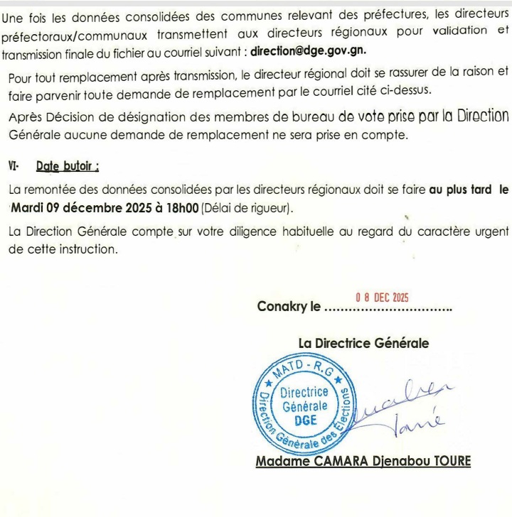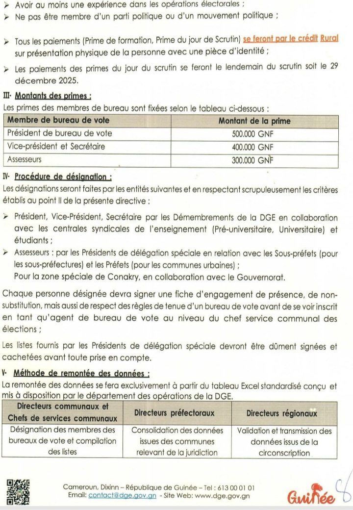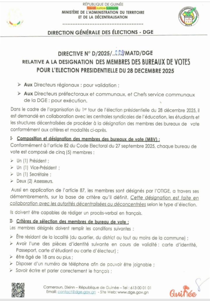 NEWSPOLITIQUE Présidentielle 2025: La DGE annonce le paiement des membres de bureaux de vote Par Directeur de Publication - 26 décembre 2025 13924 Facebook Twitter Pinterest WhatsApp Partager : Cliquez pour partager sur Facebook(ouvre dans une nouvelle fenêtre) Facebook Cliquer pour partager sur X(ouvre dans une nouvelle fenêtre) X ARTICLES CONNEXESPLUS DE L'AUTEUR Kankan : Media / La radio Horizon reprend ses émissions après plusieurs mois d’interruption de son signal Guinée : Le Président de la République dévoile la structure gouvernementale Décret : Amadou Oury Bah reconduit premier ministre LES PLUS POPULAIRESNEWS1685FAITS-DIVERS756POLITIQUE526ÉCONOMIE266SPORT123INTERNATIONAL77