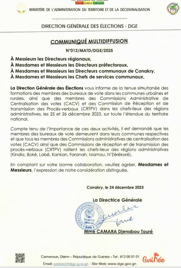 NEWSPOLITIQUE Présidentielle 2025: La DGE organise une série de formations des membres de bureaux de vote Par Directeur de Publication - 25 décembre 2025 11935 Facebook Twitter Pinterest WhatsApp Ledenonciateur224.com Partager : Cliquez pour partager sur Facebook(ouvre dans une nouvelle fenêtre) Facebook Cliquer pour partager sur X(ouvre dans une nouvelle fenêtre) X ARTICLES CONNEXESPLUS DE L'AUTEUR Kankan : Media / La radio Horizon reprend ses émissions après plusieurs mois d’interruption de son signal Guinée : Le Président de la République dévoile la structure gouvernementale Décret : Amadou Oury Bah reconduit premier ministre LES PLUS POPULAIRESNEWS1685FAITS-DIVERS756POLITIQUE526ÉCONOMIE266SPORT123INTERNATIONAL77