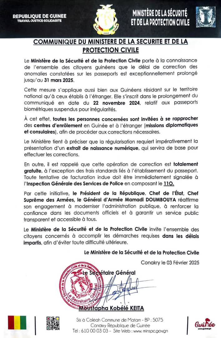 Le Ministère de la Sécurité et de la Protection Civile annonce la prolongation du délai pour la correction des anomalies détectées sur les passeports biométriques, désormais fixé au 31 mars 2025. Cette mesure concerne aussi bien les Guinéens résidant en Guinée qu’à l’étranger. Elle fait suite au communiqué du 22 novembre 2024 concernant la suspension des passeports biométriques pour irrégularités.