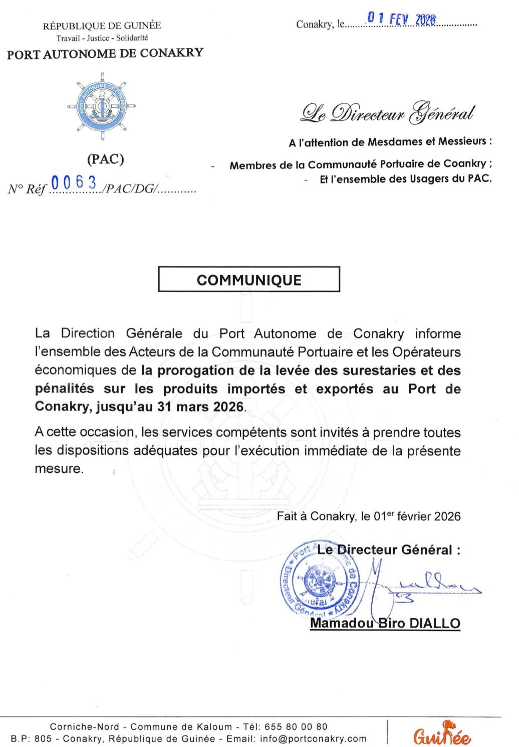 Dans le cadre de ses actions visant à soutenir la fluidité des opérations portuaires et à accompagner les acteurs économiques, la Direction Générale du Port Autonome de Conakry annonce la prorogation de la levée des surestaries et des pénalités applicables aux produits importés et exportés. Cette mesure exceptionnelle est prolongée jusqu’au 31 mars 2026 et concerne l’ensemble des acteurs de la communauté portuaire ainsi que les opérateurs économiques intervenant au Port de Conakry. Les services compétents sont, à cet effet, appelés à prendre toutes les dispositions nécessaires pour assurer l’application immédiate de la présente décision.