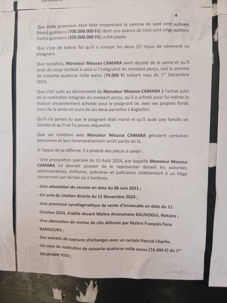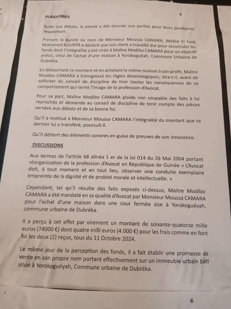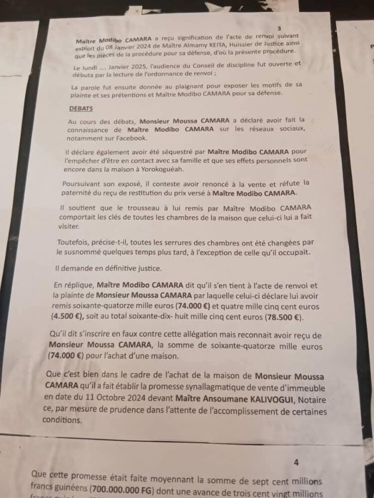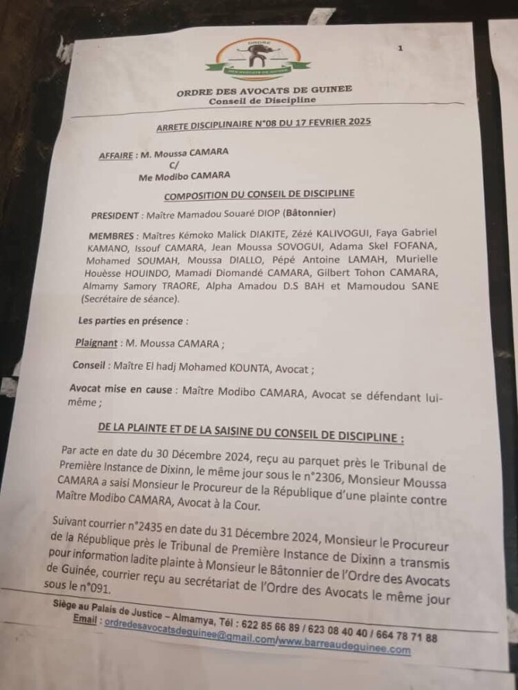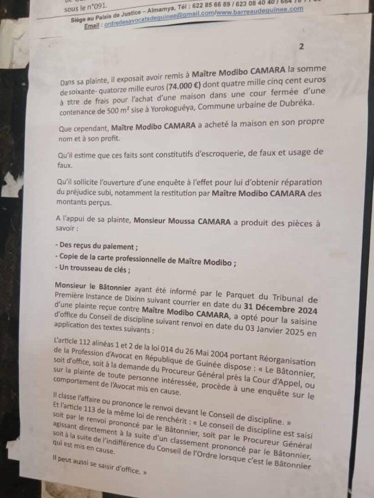 Cette sanction fait suite à une plainte déposée le 30 décembre 2024 par Moussa Camara, un homme de 72 ans, qui accuse Me Modibo Camara d’avoir détourné une somme de 74 000 euros, dont 4 500 euros destinés à l’achat d’une maison à Yorokoguéya. L’avocat aurait acheté la propriété en son propre nom plutôt qu’au nom du plaignant. Les accusations incluent escroquerie, faux et usage de faux.