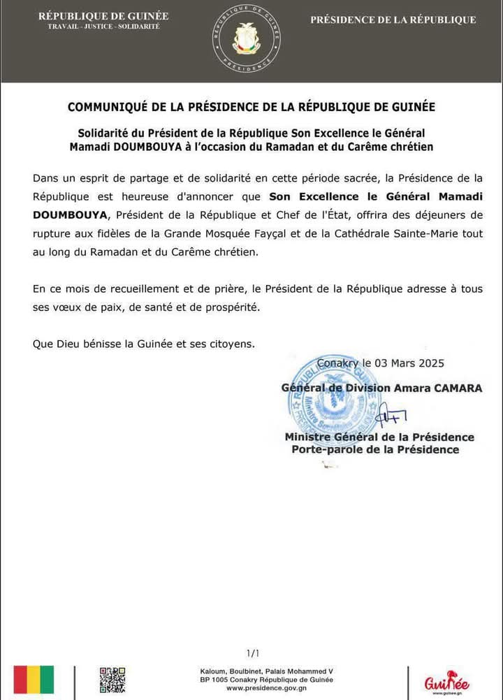 Dans un geste symbolique de fraternité interreligieuse, le Général Mamadi Doumbouya a décidé d’offrir le déjeuner de rupture aux musulmans et chrétiens, marquant ainsi un moment de partage et d’unité pendant les périodes sacrées du Ramadan et du Carême.
