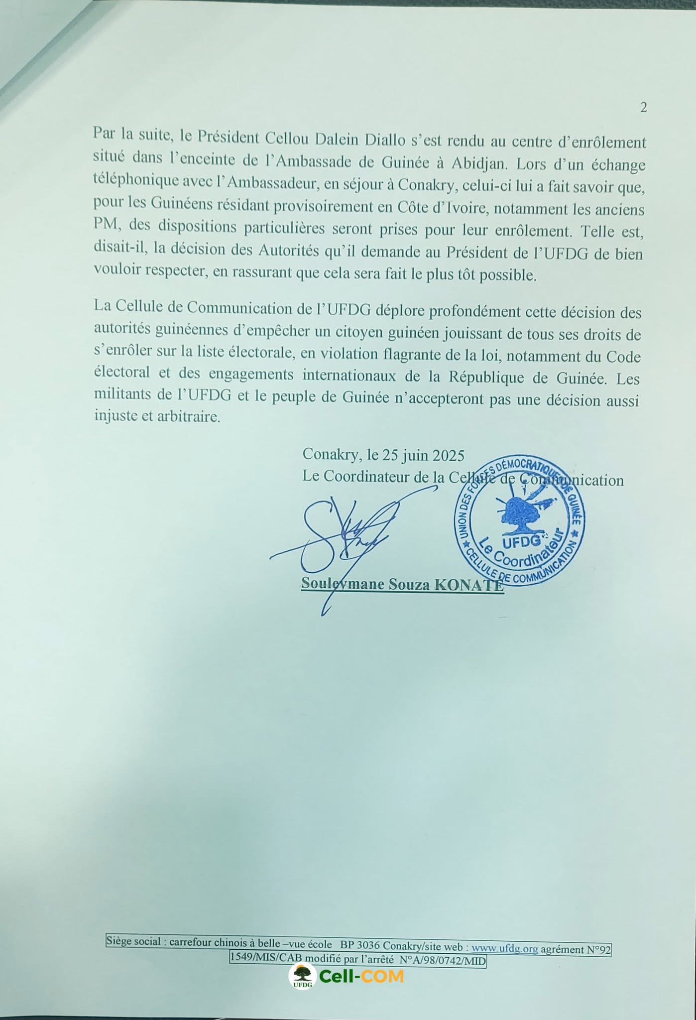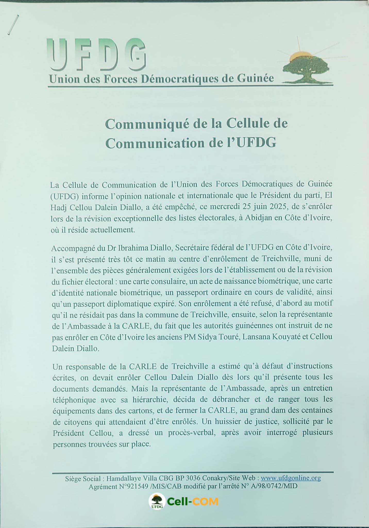 Ce mercredi 25 juin 2025, l’ancien Premier ministre guinéen et leader de l’UFDG, Cellou Dalein Diallo, n’a pas pu se faire enrôler à Abidjan dans le cadre du recensement électoral. Dans un communiqué publié en soirée, la cellule de communication de son parti dénonce une décision jugée « injuste et arbitraire ».