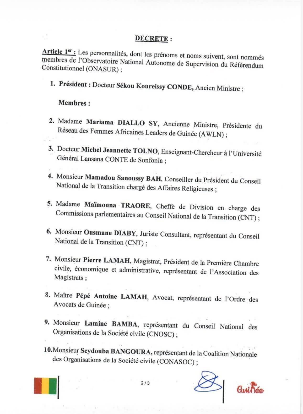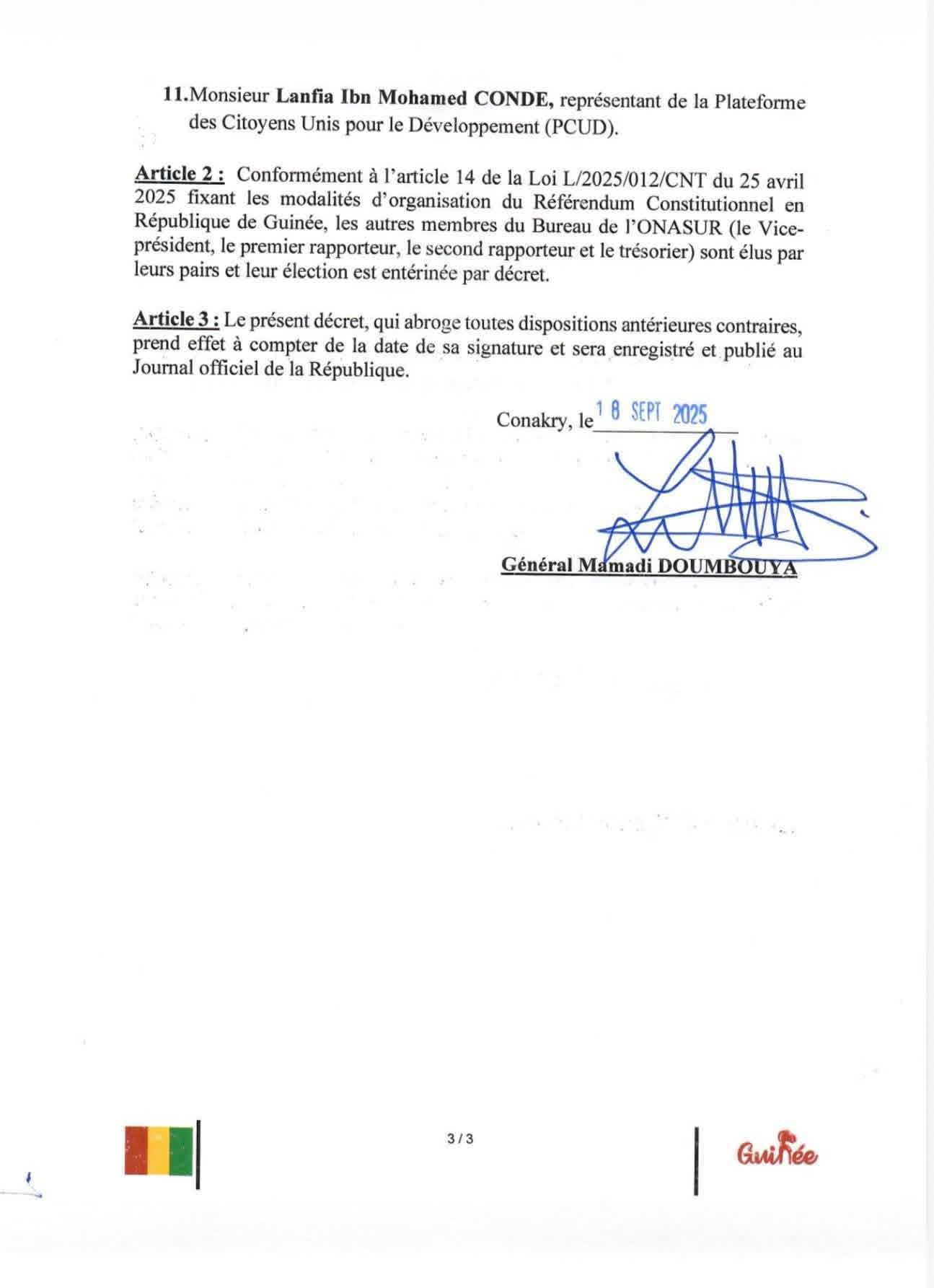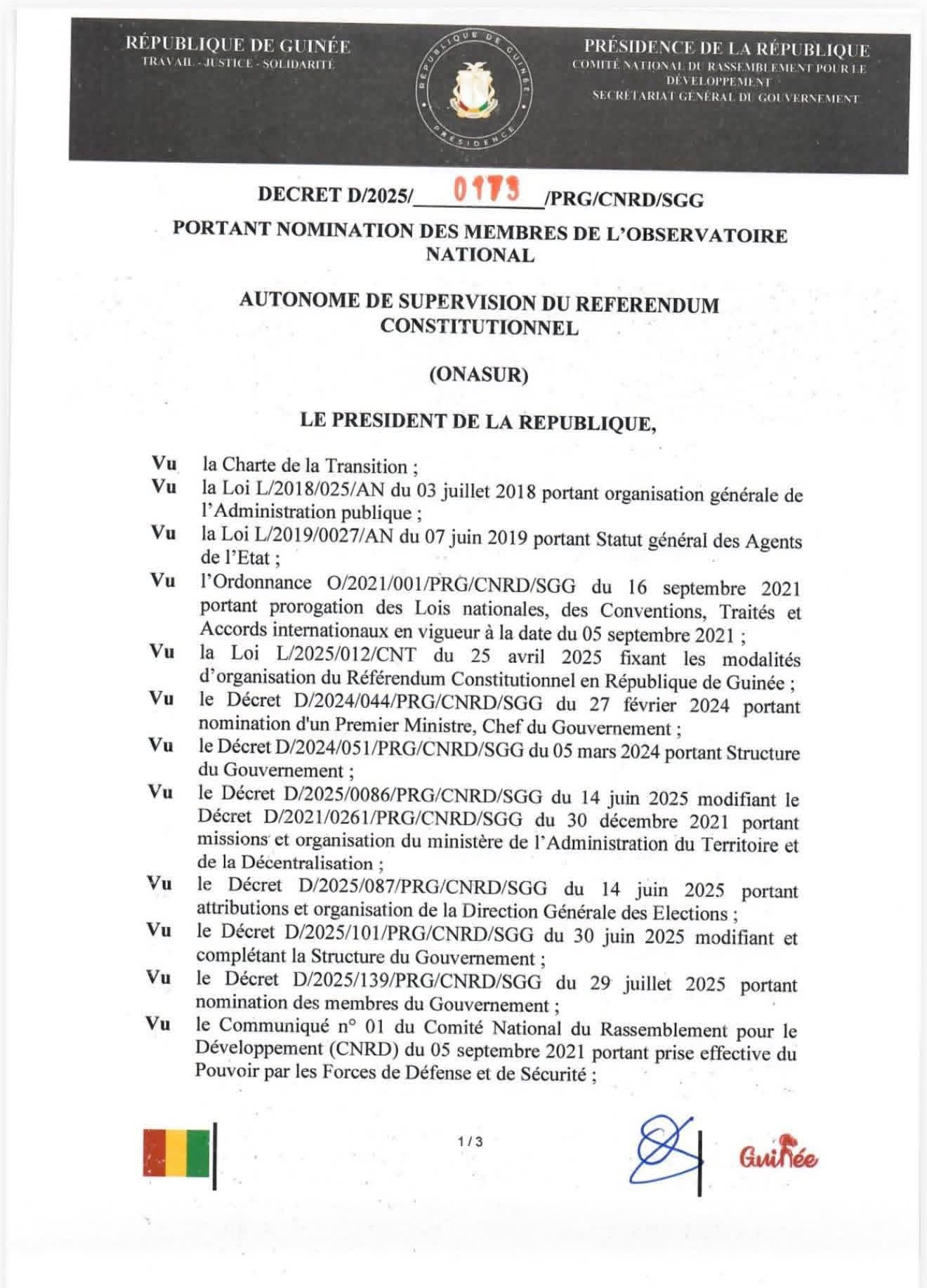 Par décret en date du 18 septembre 2025, le président de la République, le Général Mamadi Doumbouya, a procédé à la nomination des membres de l’Observatoire National Autonome de Supervision du Référendum (ONASUR).