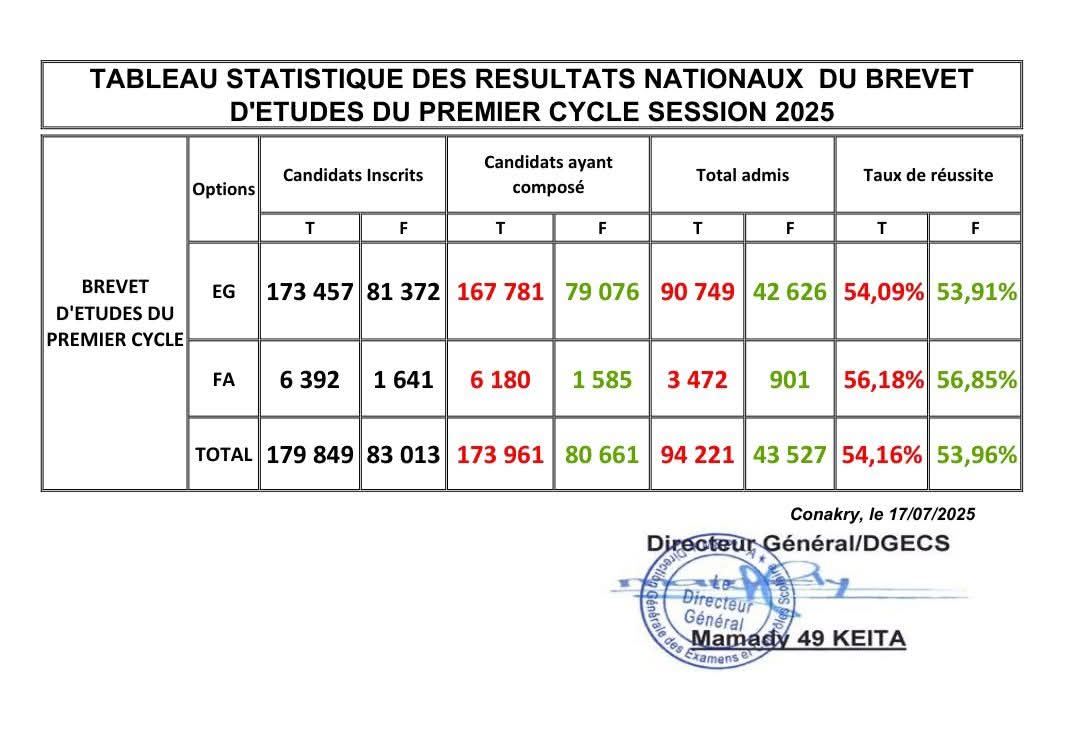 Les résultats du Brevet d’études du premier cycle (BEPC), session 2025, ont été officiellement publiés ce jeudi 17 juillet par le ministère de l’Enseignement Pré-Universitaire et de l’Alphabétisation. Selon les statistiques dévoilées, le taux d’admission s’élève à 53,96 %, marquant un niveau moyen de réussite au plan national.