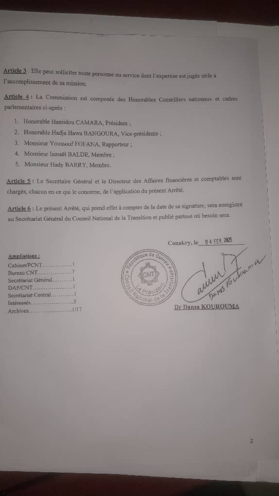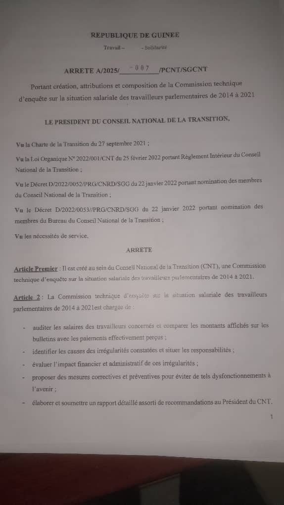 Ce mercredi 5 février 2025, le président du Conseil National de la Transition (CNT), Dr Dansa Kourouma, a annoncé la mise en place d’une commission d’enquête pour élucider un scandale de détournement de plusieurs millions, voire milliards, de francs guinéens. Ces fonds, destinés à rétribuer les salaires et primes des travailleurs parlementaires, se retrouvaient dans les poches de responsables indélicats. L’enquête, lancée dans le cadre d’un processus de réformes financières, s’attèle à faire lumière sur cette fraude systématique qui aurait perduré pendant plus d’une décennie. Si les responsables restent encore dans l’ombre, la volonté du président Kourouma de redresser la situation soulève néanmoins des attentes fortes de la part des fonctionnaires parlementaires, exigeant justice et transparence.