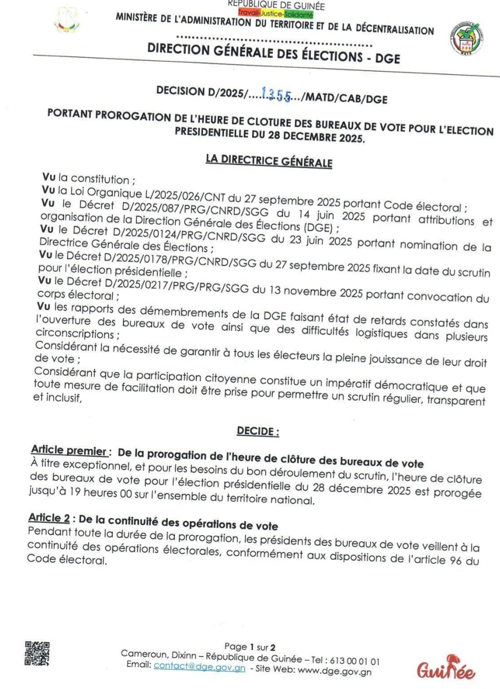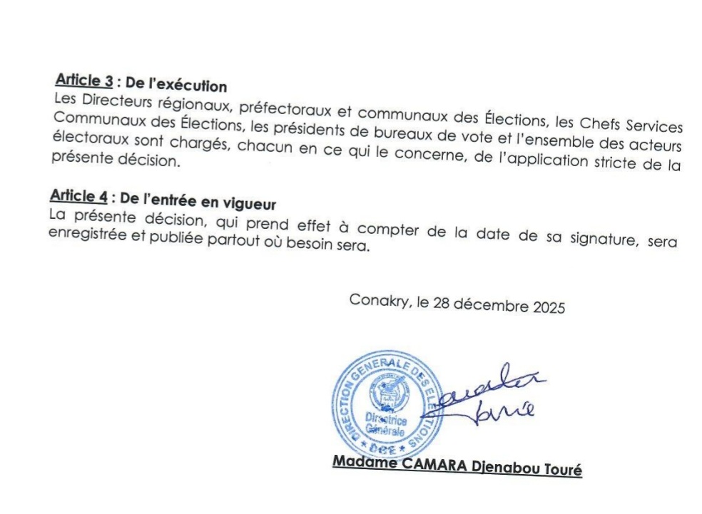NEWSPOLITIQUE Scrutin présidentiel : la DGE prolonge l’heure de clôture des bureaux de vote Par Directeur de Publication - 28 décembre 2025 6202 Facebook Twitter Pinterest WhatsApp Partager : Cliquez pour partager sur Facebook(ouvre dans une nouvelle fenêtre) Facebook Cliquer pour partager sur X(ouvre dans une nouvelle fenêtre) X ARTICLES CONNEXESPLUS DE L'AUTEUR Guinée : l’heure des choix forts pour réussir la refondation Journée mondiale de l’Éducation : l’ONG OMEGA sonne l’alarme sur l’avenir scolaire des enfants guinéens Guinée : le DGA de l’Office Guinéen de Publicité suspendu après des propos jugés diffamatoires LES PLUS POPULAIRESNEWS1680FAITS-DIVERS753POLITIQUE524ÉCONOMIE266SPORT123INTERNATIONAL77