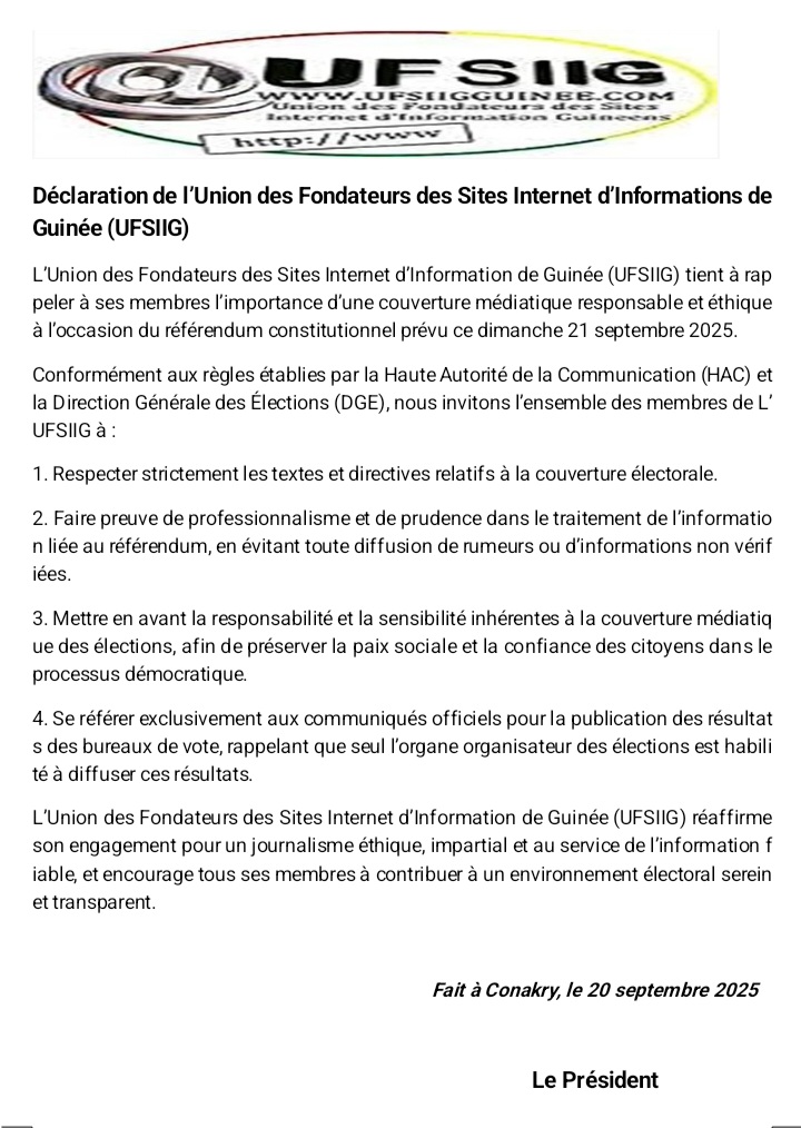 FAITS-DIVERSNEWS Scrutin référendaire : l’UFSIIG rappelle les règles de l’éthique et de la déontologie du journaliste Par Directeur de Publication - 20 septembre 2025 24571 Facebook Twitter Pinterest WhatsApp Partager : Cliquez pour partager sur Facebook(ouvre dans une nouvelle fenêtre) Facebook Cliquer pour partager sur X(ouvre dans une nouvelle fenêtre) X ARTICLES CONNEXESPLUS DE L'AUTEUR 2025, l’année du décollage historique de l’Aéroport International Ahmed Sékou Touré Recensement national des pharmaciens et des pharmacies d’officines : une étape clé pour la régulation du secteur pharmaceutique en Guinée Déguerpissement : le Président de la République s’adresse aux occupants des emprises LES PLUS POPULAIRESNEWS1700FAITS-DIVERS760POLITIQUE529ÉCONOMIE268SPORT124INTERNATIONAL84