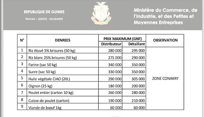 Dans la zone de Conakry, les prix sont définis selon le tableau ci-dessous.