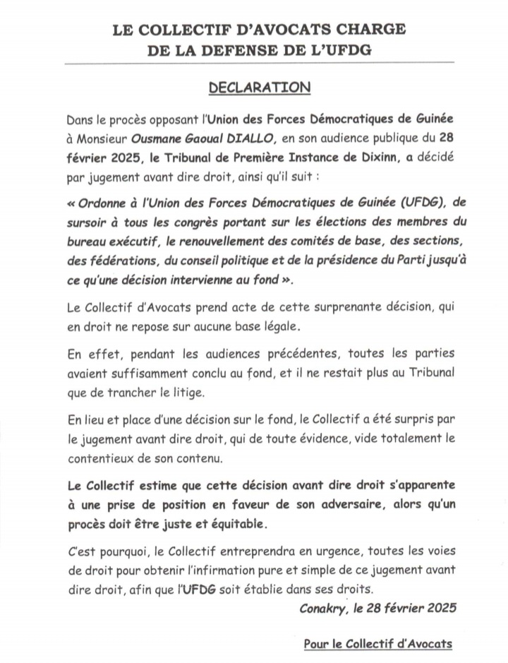 Le collectif d’avocats représentant l’Union des Forces Démocratiques de Guinée (UFDG) exprime son mécontentement après la décision du tribunal de première instance de Dixinn, qui a ordonné la suspension des congrès du parti. Cette décision suscite des interrogations et des inquiétudes parmi les membres du parti et leurs soutiens.