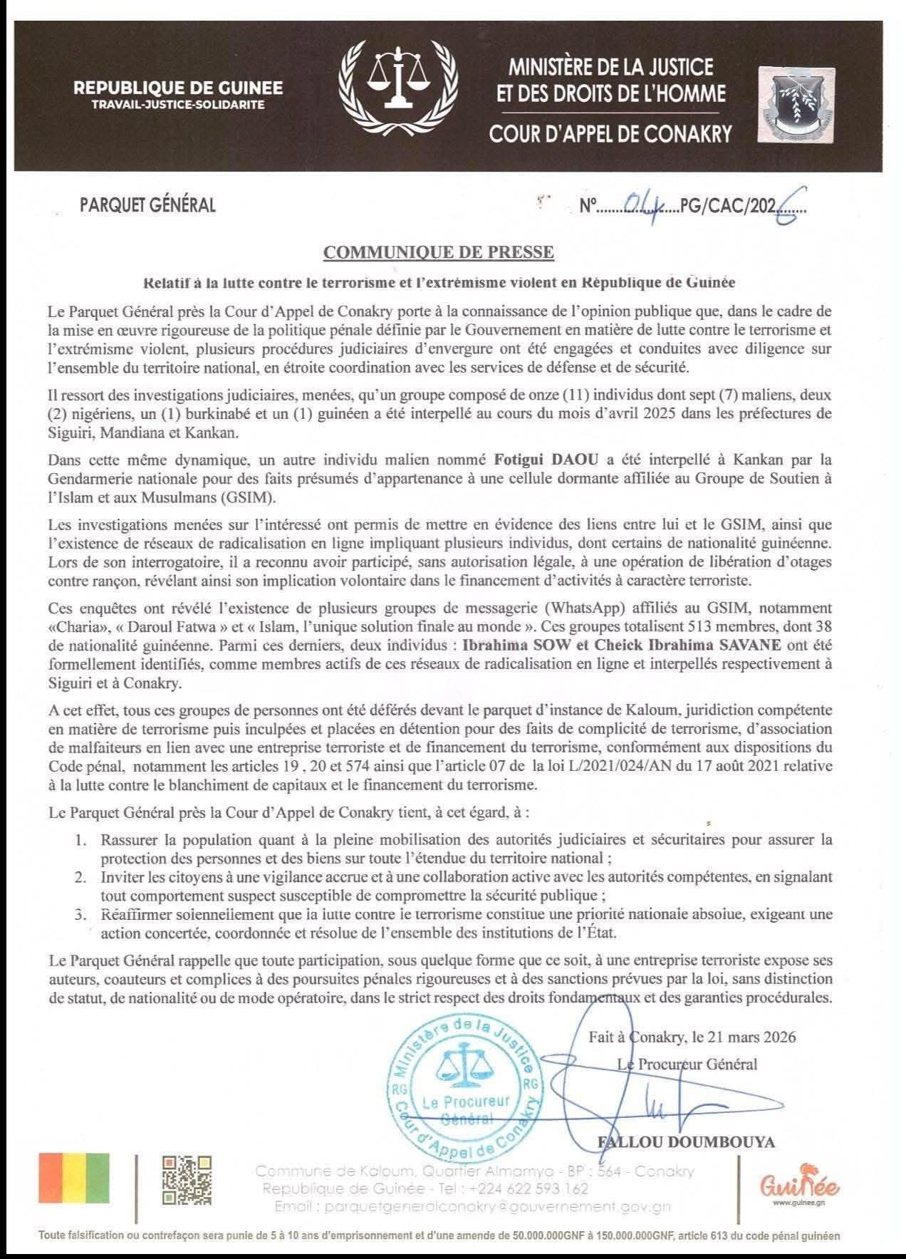 Le Parquet précise que l’opération s’inscrit dans le cadre de la politique pénale du Gouvernement guinéen visant à éradiquer l’extrémisme violent.