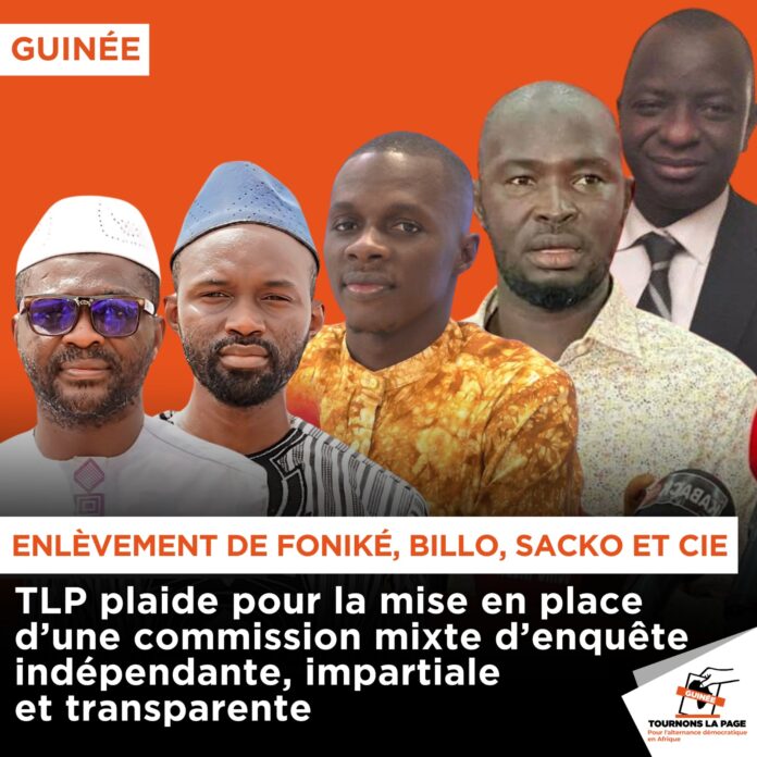 Au regard des enlèvements arbitraires et disparitions forcées comme ce fut les cas de Monsieur Oumar Sylla dit Foniké Menguè, Coordinateur du FNDC ; Monsieur Mamadou Billo Bah, Coordinateur de Tournons La Page Guinée ; Monsieur Habib Marouane Camara, fondateur du site lerevelateur224.com et Monsieur Sadou Nimaga, ancien secrétaire général du Ministère des Mines et de la Géologie, la Coordination Pays de Tournons La Page (TLP) Guinée plaide le gouvernement Guinéen pour la mise en place d’une commission mixte d’enquête indépendante, impartiale et transparente incluant des représentants de la société civile et des organisations internationales pour enquêter sur les disparitions forcées des défenseurs de la démocratie, des droits humains et d’une gouvernance vertueuse des ressources publiques en Guinée.