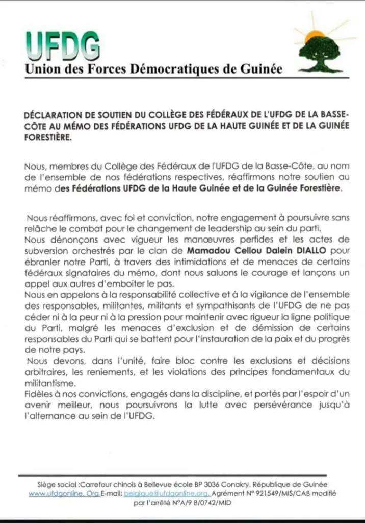 Dans un contexte de réflexion sur l’avenir politique de l’Union des Forces Démocratiques de Guinée (UFDG), plusieurs secrétaires fédéraux de la Basse-Guinée montent au créneau pour réclamer une alternance à la direction du parti, jusque-là incarnée par Cellou Dalein Diallo. Ces responsables de terrain estiment qu’un renouvellement du leadership est nécessaire pour insuffler une nouvelle dynamique à la formation politique et mieux répondre aux attentes de la base.